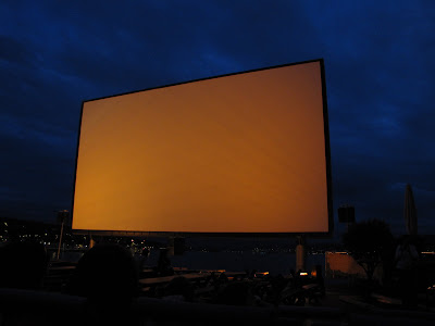 Last night the Boy and I dragged our tired, battered, sunburned butts* to Orange Cinema Night. Located in Zurichhorn Park, a nightly movie is shown on the big screen between July 15th and August 15th. The setting is stunning - the screen literally sits in lake, which is lit with twinkling lights, casting their reflections off the water's surface. The semi-comfortable seats only give you minor tingling by hour 2 and if you look really close, you can spot bats flying in front of the screen. Hey, wildlife sightings are hard to come by here so this excited me.